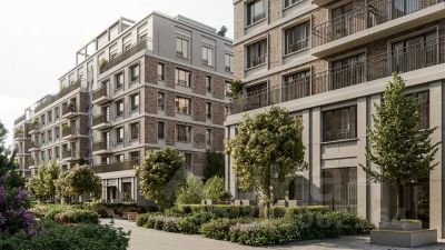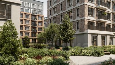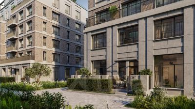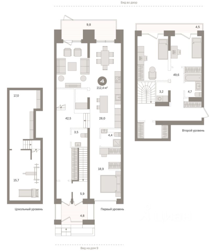 Двухуровневая квартира с кухней-гостиной и четырьмя спальнями в жилом районе "Речной порт". Особенности планировки: вид во двор, двухуровневая, окна в пол, предчистовая отделка, терраса.