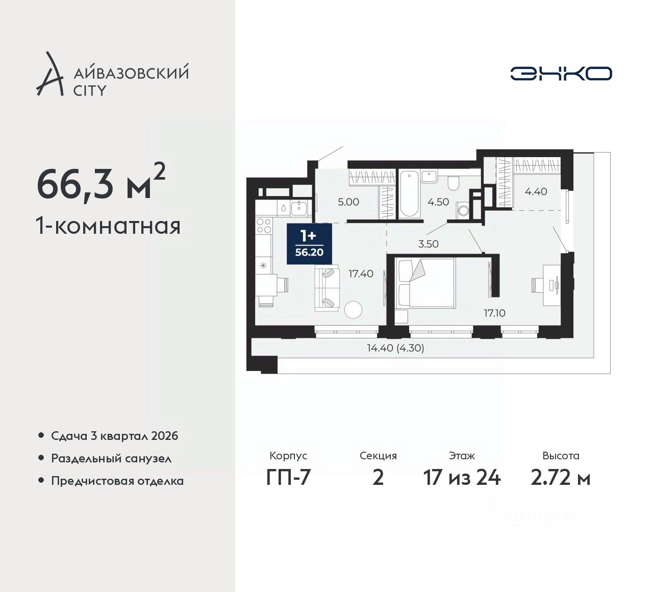 Продается 1-комн. квартира с предчистовой отделкой в ЖК "Айвазовский" на 17 этаже. Общая площадь: 66.3 кв.м. Высота потолков 2.72 м.