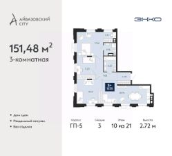 Трехкомнатная квартира от застройщика в ЖК "Айвазовский" на 10 этаже. Квартира без отделки, после выдачи ключей можно делать ремонт. Общая площадь: 151.48 кв.м. Высота потолков 2.72 м.