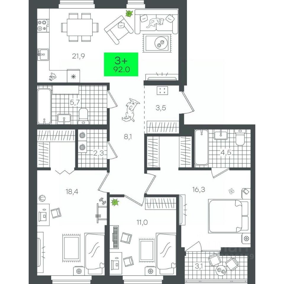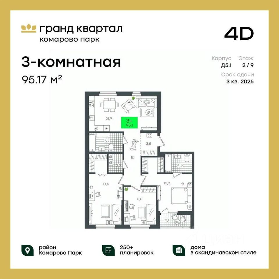 Продаётся 3-комнатная квартира в строящемся доме (1-Д5.1 (Малкова, 5)), срок сдачи: III-кв. 2026, общей площадью 95.17 кв.м., на 2 этаже. Компания 4D приступила к строительству нового жилого комплекса "Гранд квартал". Новый ЖК находится в зеленой зоне Калининского района, южнее микрорайона Тюменская слобода.