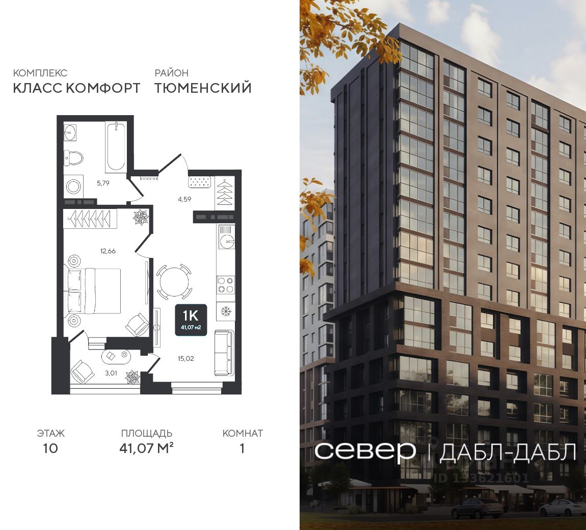Продаётся квартира площадью 41.07 м2 в жилом комплексе "Дабл-Дабл". Квартира находится на 10 этаже, жилая площадь квартиры м2, площадь просторной кухни — м2. Среди особенностей планировки — изолированные комнаты с окнами на одну сторону, 1 совмещённый санузел.
