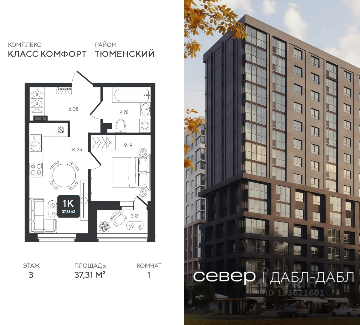 Продаётся квартира площадью 37.31 м2 в жилом комплексе "Дабл-Дабл". Квартира находится на 3 этаже, жилая площадь квартиры м2, площадь просторной кухни — м2. Среди особенностей планировки — изолированные комнаты с окнами на одну сторону, 1 совмещённый санузел.