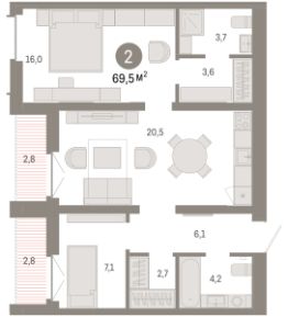 Продается двухкомнатная квартира с предчистовой отделкой в ЖК "Республики 205" на 3 этаже. Общая площадь: 69.47 кв.м., жилая: 23.1 кв.м., площадь просторной кухни-гостиной: 20.5 кв.м. Комнаты изолированные, все окна выходят на одну сторону. В квартире две лоджии, два совмещенных санузла. Высота потолков 2.7 м.