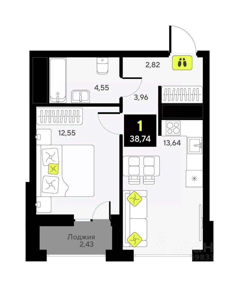 Просторная 1-комн. квартира в ЖК "Мотивы" на 2 этаже. Общая площадь: 38.9 кв.м. Высота потолков 2.7 м.