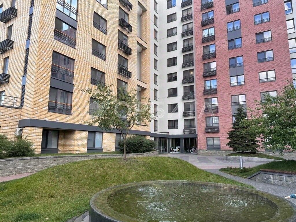 Благоустроенный двор с фонтаном, зелёными насаждениями и зонами отдыха