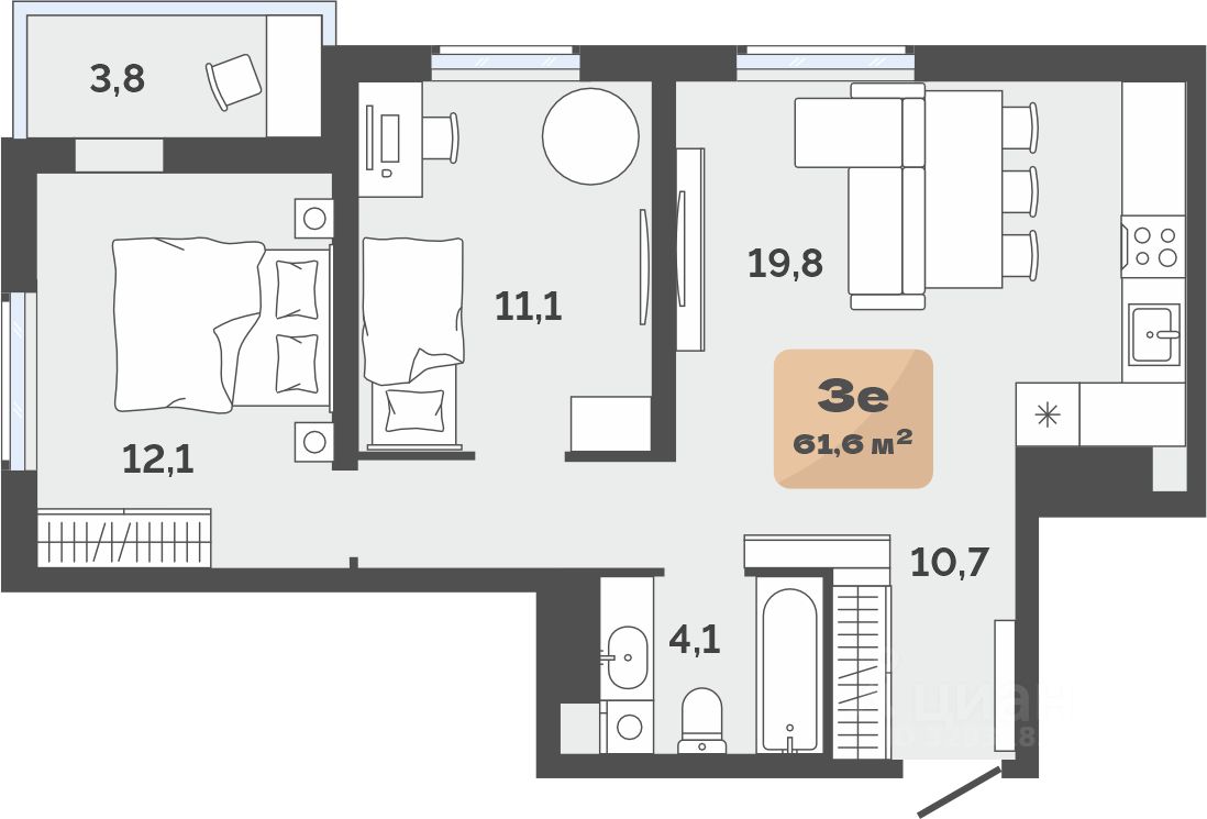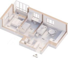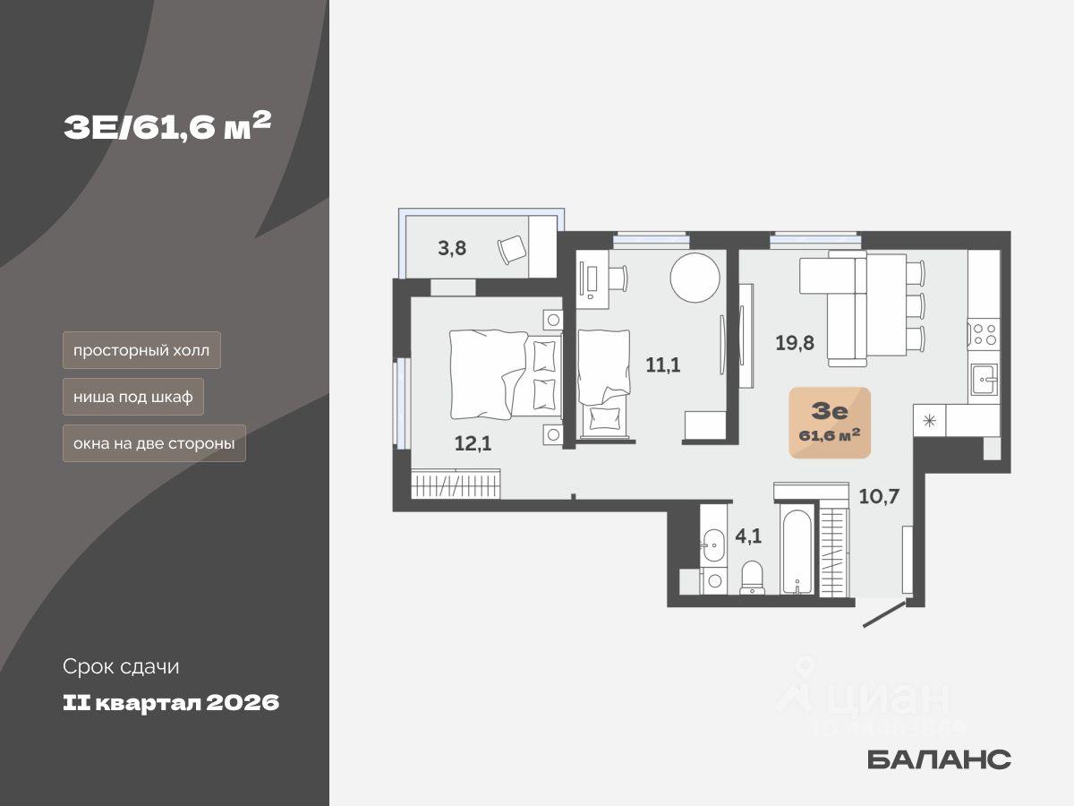 Квартира в евроформате с кухней-гостиной и второй спальней. В одной из комнат выход на лоджию с угловым панорамным остеклением. Он с окнами в пол — будет больше света. В холле ниша под шкаф и установку обувницы.
