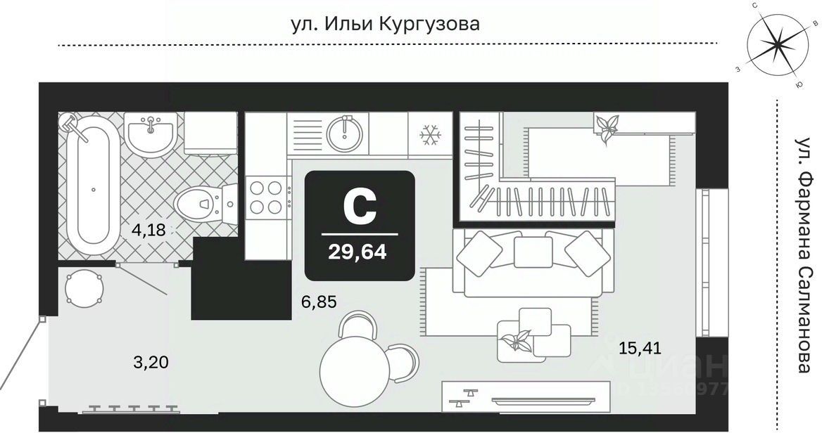 Просторная однокомнатная квартира-студия с предчистовой отделкой в ЖК "Мидгард в Комарово Парк" на 4 этаже. Общая площадь: 29.64 кв.м., площадь гостиной 22.26 кв.м., из которых 6.85 кв.м. выделено под кухонную зону. Все окна выходят на одну сторону. В квартире один совмещенный санузел. Высота потолков 2.72 м.