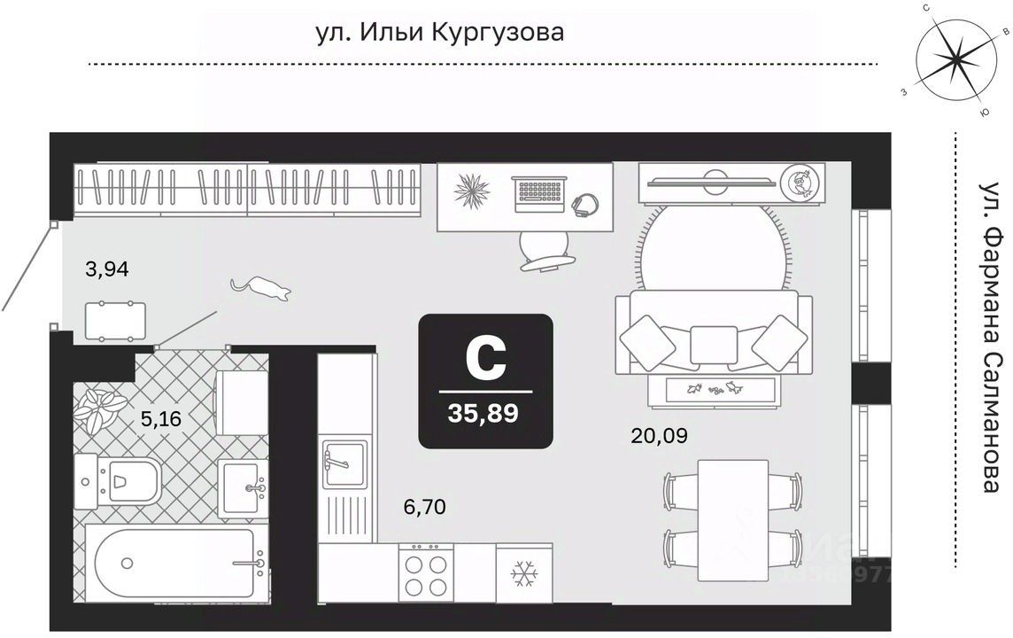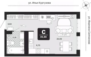 1-комн. квартира-студия от застройщика с предчистовой отделкой в ЖК "Мидгард в Комарово Парк" на 4 этаже. Общая площадь: 35.89 кв.м., площадь гостиной 26.79 кв.м., из которых 6.7 кв.м. выделено под кухонную зону. Все окна выходят на одну сторону. В квартире один совмещенный санузел. Высота потолков 2.72 м.