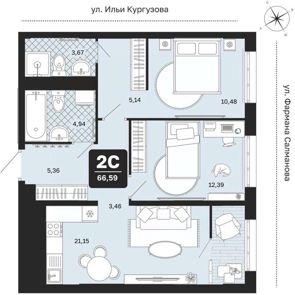 Просторная 2-комн. квартира с предчистовой отделкой в ЖК "Мидгард в Комарово Парк" на 4 этаже. Общая площадь: 66.59 кв.м., жилая: 22.87 кв.м., площадь просторной кухни-столовой: 21.15 кв.м. Комнаты изолированные, все окна выходят на одну сторону. В квартире одна лоджия, два совмещенных санузла. Высота потолков 2.72 м.