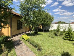 Ухоженный участок: газон, цветы, сад (рябина, калина, малина, черешня, яблоня, сосна, кедр, ель). Детская песочница и качель. Площадка перед гаражом и дорожки из натурального камня на бетонной подушке. Хорошая транспортная доступность.