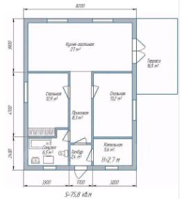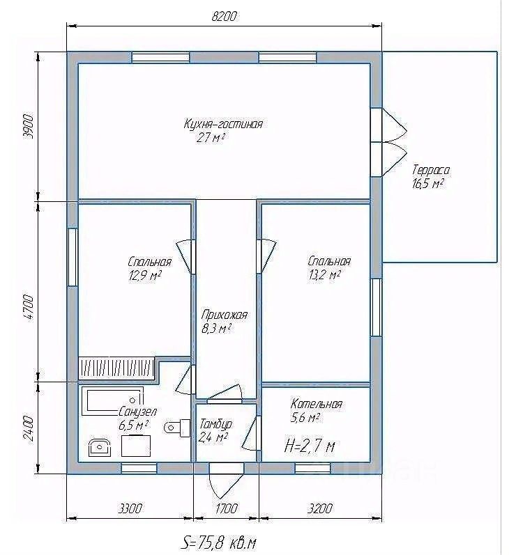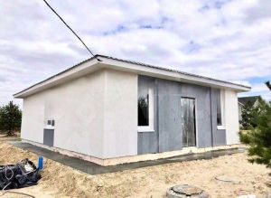 Дом 8.2м на 11м. Внутренняя площадь - 75,8 кв.м (кухня-гостиная 27 кв.м, 2 комнаты по 13 кв.м., совмещенный санузел 6,5 кв.м, тамбур, котельная с выводом под дополнительный унитаз. Будет закладная под террасу 16 кв.м (крыша и столбы), предусмотрен выход из кухни-гостиной. Дом сдается в предчистовой отделке - на полу стяжка, штукатурка и шпаклевка стен.