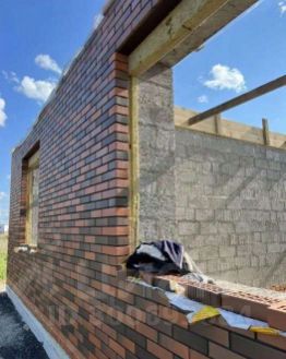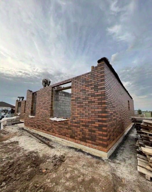 Фасад - облицовочный кирпич М-175 красный флеш, завод ЛСР, с применением черного пигмента.