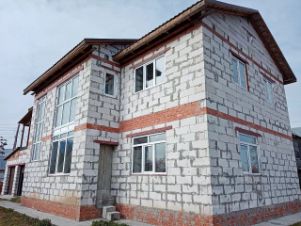 Дом построен из газоблоков "поревит". Крыша скатная, снег на ней не задерживается. Вода- скважина.