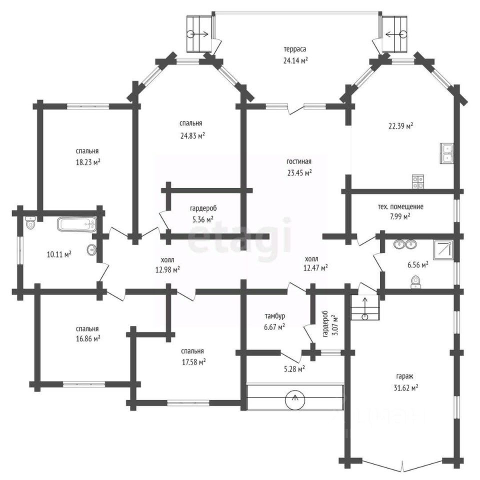 В доме 4 спальни, площадью от 17 до 25 кв.м., просторная гостиная 26 кв.м., кухня 22,5 кв.м., два санузла, площадью 6,5 и 10 кв.м.