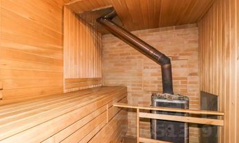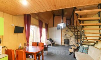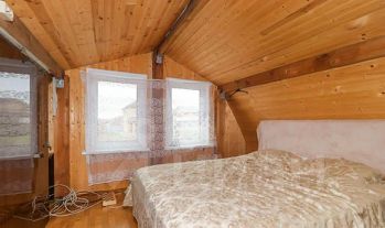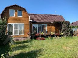 Дом построен из бруса, утеплён и обшит имитацией из сосны. Внутри расположены кухня-гостиная с витражным окном и выходом на террасу, санузел, сауна с небольшим бассейном. На втором этаже (мансарде) находятся две комнаты. Все готово к проживанию.