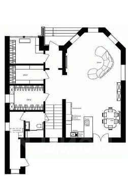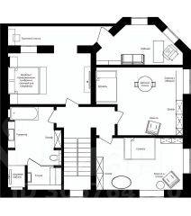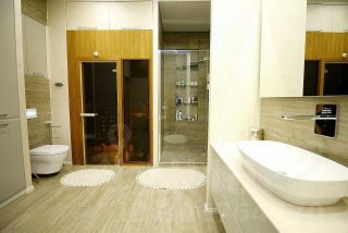 На первом этаже расположены кухня-гостиная, три гардеробных комнаты, санузел с душем и техническая комната со всеми коммуникациями. На втором этаже находятся три спальни, кабинет и один большой санузел с ванной, душевой и сауной.