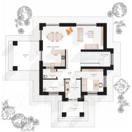 На первом этаже расположена просторная кухня-гостиная с выходом на террасу, одна спальня и кабинет, санузел. На втором этаже находятся четыре спальни и ванная.