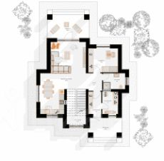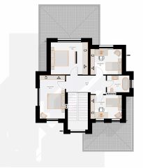 На первом этаже: кабинет, кухня-гостиная с выходом на террасу. На втором этаже расположены четыре спальни и ванная.