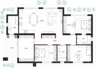 В доме расположены просторная кухня-гостиная, 3 спальни, 2 санузла.