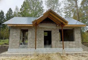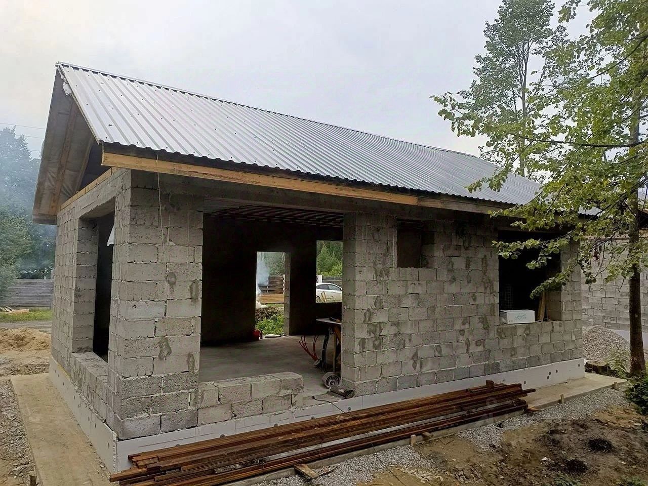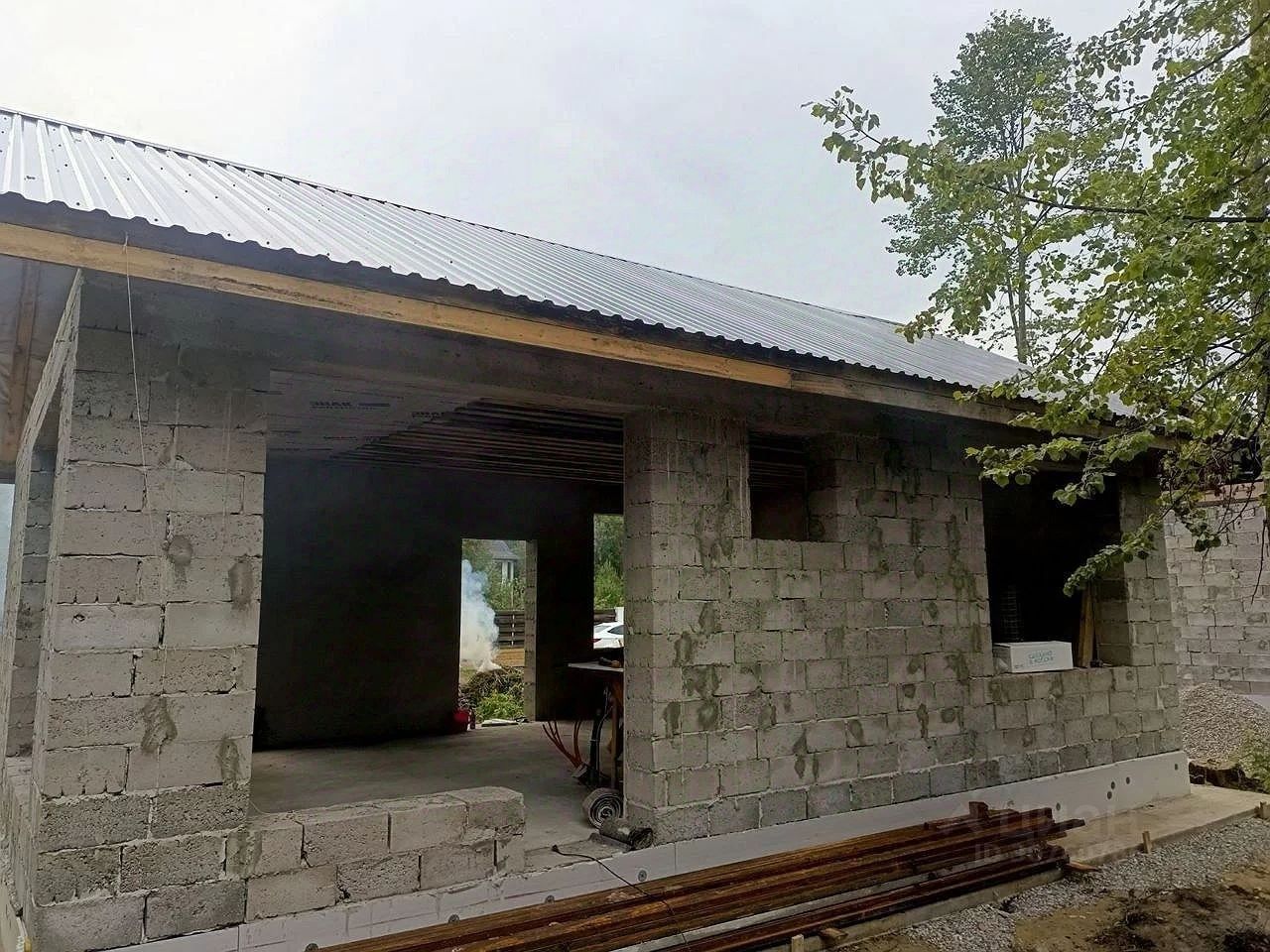 Стены выполнены из керамзитоблока толщиной 30 см, что обеспечивает отличную теплоизоляцию. Внутренняя сторона стен оштукатурена, что облегчает дальнейшие отделочные работы. Теплый пол и стяжка уже готовы, что позволяет сразу приступить к укладке напольного покрытия. Проемы подготовлены для установки панорамных окон, которые наполнят пространство естественным светом.