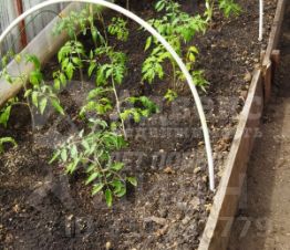 --Земельный участок прямоугольной формы, разработан, примыкает ко входу в дом и огорожен сеткой рабица от участков соседей. В конце участка стоит новая теплица, есть туалет, летний водопровод.