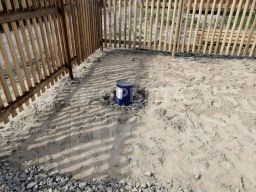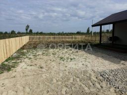 огорожен со всех сторон металлическим забором, лицевая сторона евроштакетник