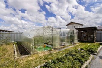 - две теплицы из поликарбоната размером 3м*6м каждая, залиты на сваях, грядки в теплицах из пластика.