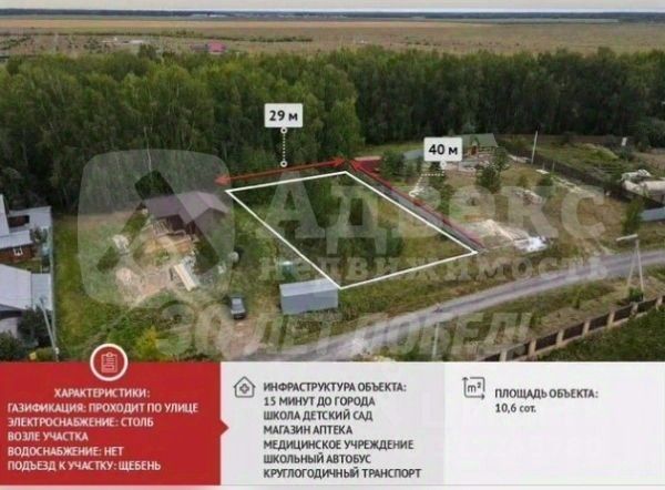 Коммуникации: электрический столб по границе участка с возможностью подключения электроэнергии по нормам ИЖС, газопровод вдоль участка.