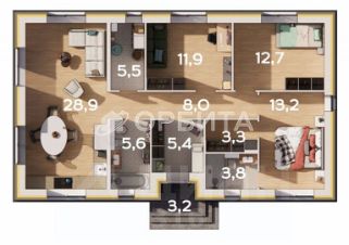 • Общая площадь 100 кв. м: 3 спальни , включая мастер-спальню, просторная кухня-гостиная с вторым светом и выходом на террасу .