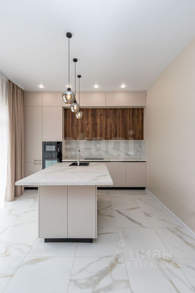 В кухне- гостиной уже установлен кухонный гарнитур с встроеной бытовой техникой марки "Крона" (холодильник, посудомоечная машина, варочная панель, духовой шкаф), стол, стулья, диван, в спальнях кровати и в кабинете еще один диван.