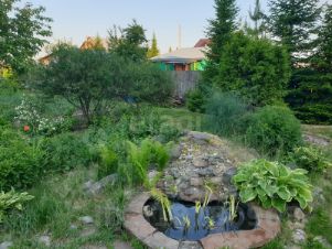 В саду плодоносящие деревья: яблони, груши, а также кустарники жимолости, вишни, сливы, смородины, крыжовника и малины. Так же на участке растут дубы, ели, пихты, кедры, березы, сосны и туи, а также множество многолетних цветов, создающих неповторимую атмосферу.