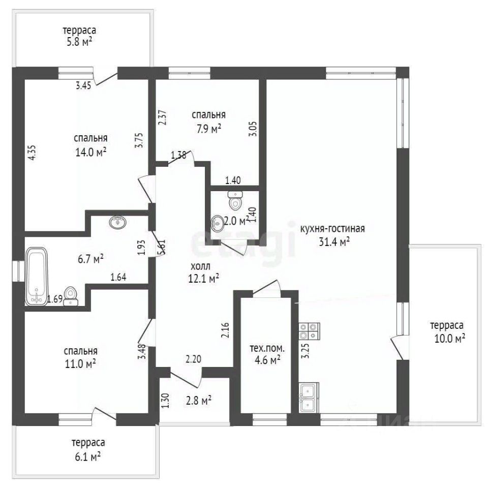 Высота потолков 3 м, вентиляция в кухне, санузлах и котельной — комфортный микроклимат в доме.