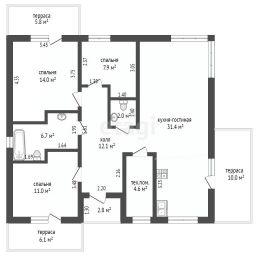 Планировка очень функциональная: 3 отдельные спальни, одну можно использовать под кабинет; 2 санузла, котельная и светлая кухня - гостиная с 3 - мя окнами, в доме очень много света!
