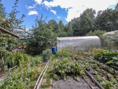 Плодородная почва для овощей и плодово-ягодных культур. Две теплицы для огурцов и помидор - 26 шт., плодовые деревья - яблони 5 шт., груши 2 шт., вишня 4 шт., слива 2 шт., алыча, ирга, черноплодная рябина, плодовые кустарники - черная смородина, крыжовник, малина, жимолость, Ягода - виктория, ремонтантная земляника, клубника. Многолетние цветы: сирень белая и сиреневая, жасмин, пионы, розы, лилии, тюльпаны, различные ирисы, хоста, хризантемы.