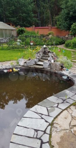 Ухоженная, благоустроенная территория участка с ландшафтным дизайном: -дорожки вымощены камнем, брусчатка, газон, искусственный пруд с горкой - фонтаном и мостиком.