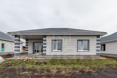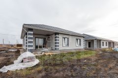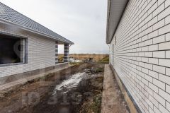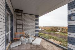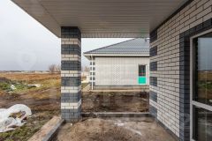 Фундамент дома высотой 45 см обеспечивает надежность и долговечность. Стены выполнены из керамзитоблоков толщиной 30 см с утеплителем (пенопласт 10 см) и облицованы серым и белым кирпичом, что придает зданию стильный внешний вид. Дом оснащен армопоясом для дополнительной прочности конструкции.
