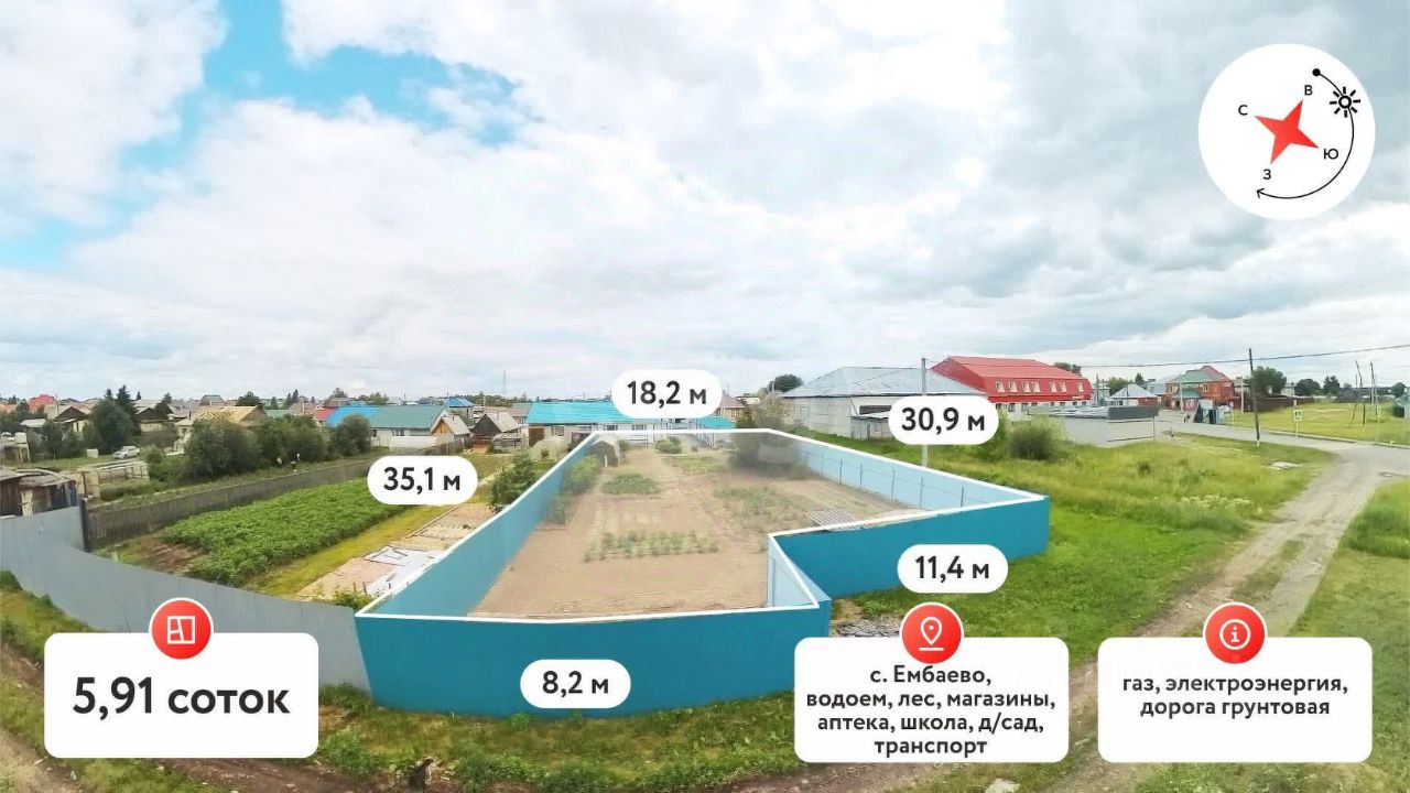 Продаётся отличный земельный участок площадью 6 соток в центре села Ембаево — уютное, зелёное, обжитое место всего в 20 минутах от города!