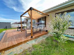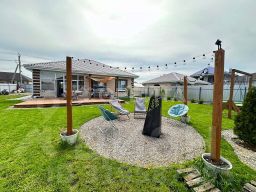 В доме большая и светлая кухня-гостиная 38,7 кв.м. с Био-камином и выходом на террасу, 3 спальни, 2 санузла, котельная, Крытая терраса для использования в любое время года - можно организовать спортивную или лаундж-зону.