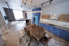 1 этаж: просторная кухня-гостиная 53 кв м, это функциональное пространство, где гармонично сочетаются зона для приготовления пищи, обеденная зона и уютная гостиная с мягким диваном. Здесь выполнено все с комфортом для всей семьи и продуманной эргономикой. Вместительные шкафы, где спрятана вся мелкая бытовая техника и ничего не загромождает ваш взгляд. Обеденная зона на 6-8 персон, стол из натурального мрамора, ножки из натурального камня. Панорамные окна с видом на зеленую зону. На 1 этаже также имеется гостевой сан узел, котельная, где установлены: газовый котел Baxi, водонагреватель на 80 л, фильтрация воды, насос повышения давления воды.