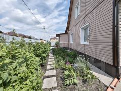 Участок полностью благоустроен: проложены дорожки из тротуарной плитки, выделены зоны под парковку, сад и огород. На территории высажены плодовые деревья — яблони, груши, кустарники (малина, смородина, клубника), разбиты грядки. Дополнительные постройки включают гараж с автоматическими воротами и системой хранения инструментов, новую баню с парилкой, помывочной и комнатой отдыха, а также летнюю мастерскую и хозяйственный блок для садового инвентаря.