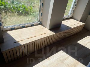 В жилых комнатах установлены подоконники из массива ясеня, а в спальне есть двуспальная кровать из массива сосны с выдвижными ящиками.