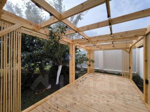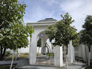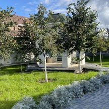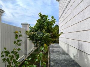 За участком посажены пихты, ели, жасмин.