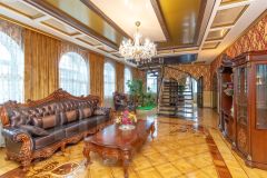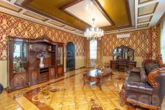 На первом этаже расположены: кухня 31.7 кв.м., гостиная 31.7 кв.м, холл 50.1 кв.м., совмещенный санузел 11.3 кв.м. на полу плитка, водяной теплый пол от газового котла, потолки натяжные комбинированные с гипсокартоном. На кухне установлен кухонный гарнитур со встраиваемой техникой. В обеденной зоне дорогостоящая итальянская мебель.