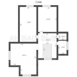 На втором этаже: 3 спальни - 24,7 м2, - 19,8 м2, - 15,8 м2, санузел совмещён, 2 подсобных помещения, высота потолков - 2,5 м.