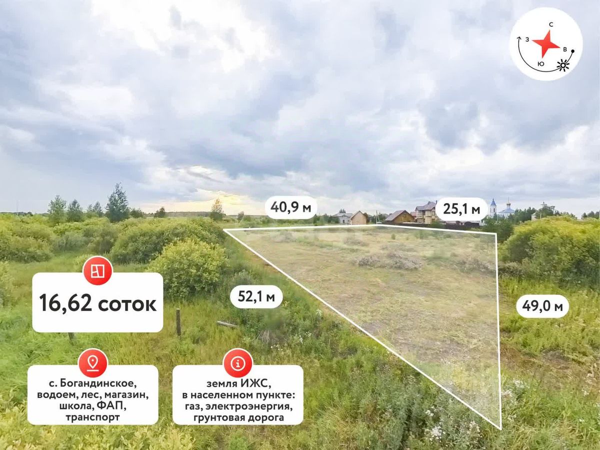Участок площадью 16,62 соток расположен на въезде в поселок Богандинское, (в зоне ж1 есть ври магазины ) что делает его идеальным для коммерческого использования — размещения магазинов.