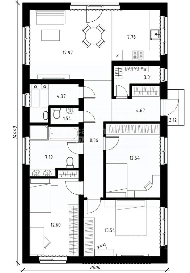 грамотно распланированы все мокрые точки и выводы для электроприборов с учетом зонирования во всех комнатах.