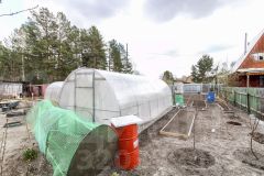 На участке расположен каркасный дом с автономным отоплением (отопительный водогрейный котел на жидком топливе), электричество заведено в дом. Водоснабжение обеспечено 2 скважинами. Есть отдельная кухня, баня,  две хозпостройки, металлический гараж, две теплицы, летний душ.