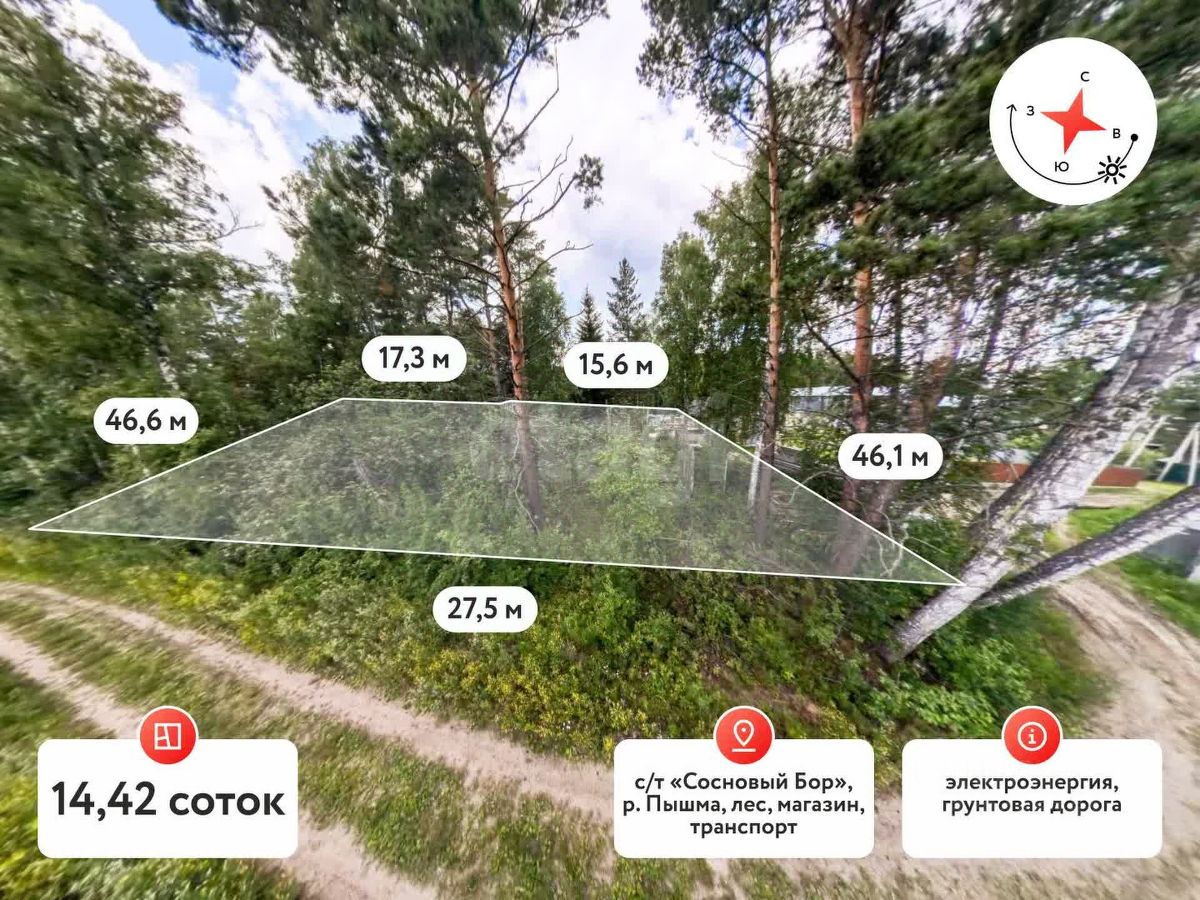 Предлагается к продаже земельный участок, в удивительно красивом месте который находится вдоль реки Пышма, и окутан лесным массивом, общей площадью 14,4 сот. в одном из элитных дачных обществ, в садовом обществе "Сосновый бор", что расположилось по соседству села Онохино по Червишевскому тракту.