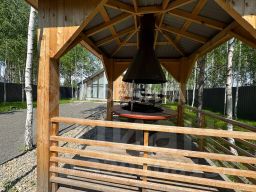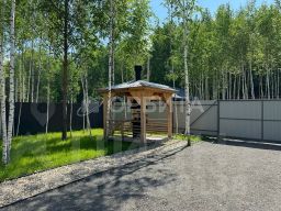 Мангальная зона, газон, дорожки из щебня и молодые деревья