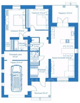 Планировкой предусмотрен просторный тёплый гараж на одно машино-место. Котельная расположена в гараже.